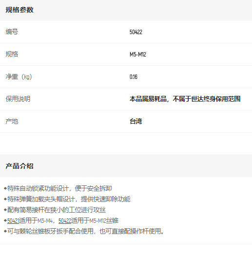 首頁>產品中心>其他手動工具>其他手動工具及配件>世達絲錐轉接頭M5-M12
